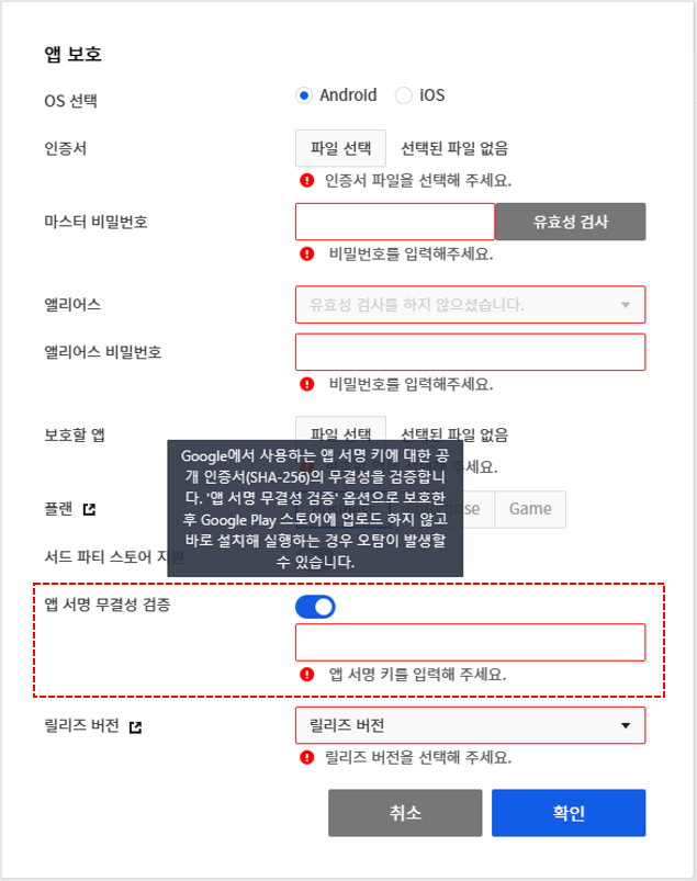 - 앱보호의 "앱 서명 무결성 검증"을 On으로 설정합니다.