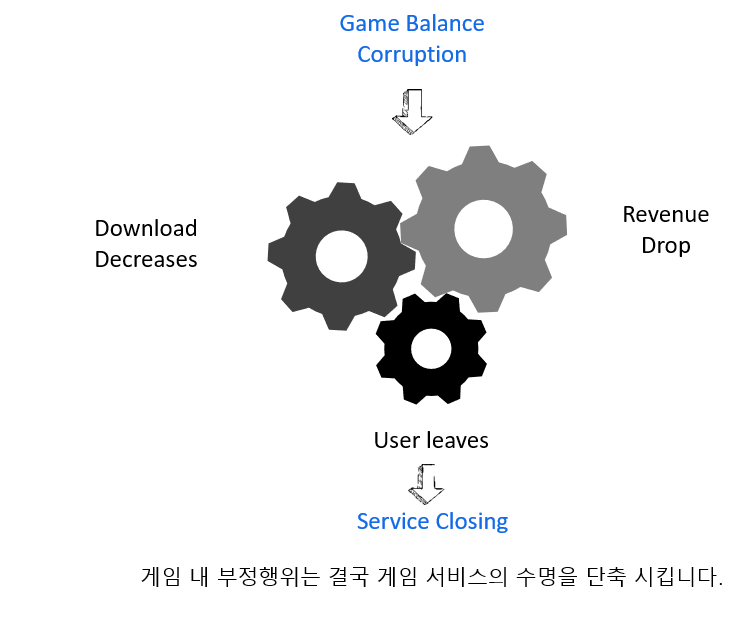게임 내 부정행위 중 가장 큰 비중을 차지하는 게임 재화의 조작은 게임 밸런스 붕괴를 불러오게 되며, 게임 내에서 밸런스 붕괴는 결국 기존 유저 이탈, 매출 감소 그리고 신규 고객 감소를 반복하게 됩니다. 이는 곧 게임서비스의 빠른 종료로 이어지게 됩니다.