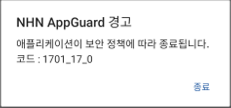 NHN AppGuard는 어뷰징 탐지 시 아래와 같이 팝업창으로 알림 기능을 제공하고 있습니다.