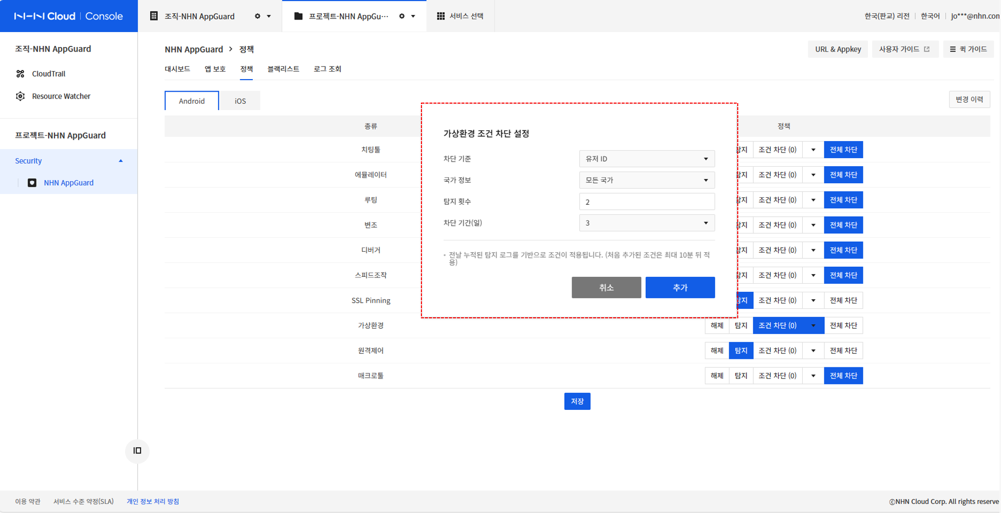 - 적용 규칙: 새롭게 설정된 조건 차단 규칙만 적용
