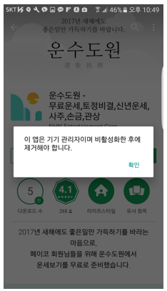 - 자사가 서비스했던 앱의 사례로 해커는 정상적인 운수도원 앱에 악의적인 코드를 추가하였고 위 <그림 1>처럼 강제적인 광고 노출을 통해 수익을 얻었으며 위 <그림 2>처럼 권한을 이용해 일반적인 삭제 방법으로 삭제를 못하도록 하였습니다.