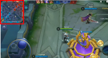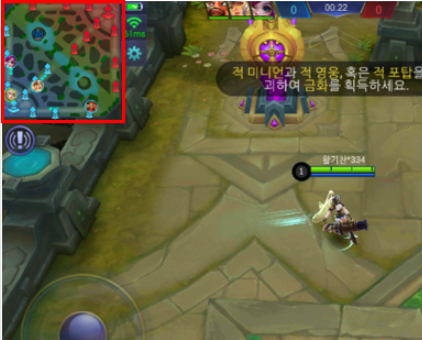 - 위 <그림 3>, <그림 4>는 MOBA 장르의 모바일 게임의 화면이며 정상적인 앱의 경우 <그림 3>처럼 게임 시작 시 왼쪽 상단 미니 맵에서 적의 위치가 파악되지 않습니다.