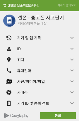 - 위 <그림 10>처럼 안드로이드 6.0 이상 기기에서는 앱에서 해당 권한이 필요할 때 사용자로부터 권한을 허가받도록 되었으며 불필요시 거부를 하시는 것을 권장하며 사용자가 권한을 허가를 하여도 설정->애플리케이션 -> 앱 이름 -> 권한 설정에서 변경이 가능합니다.