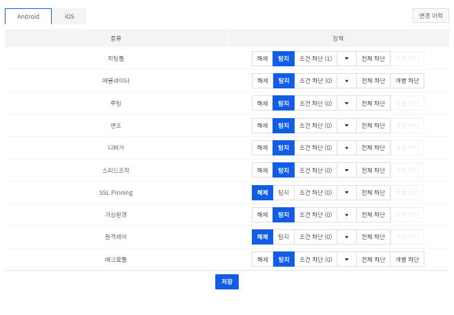 원하시는 대로 설정을 진행하시면 되며, 리스트에 없는 에뮬레이터는 메뉴 맨 상단의 "에뮬레이터 개별 차단 기본 정책"의 설정을 적용 받게 됩니다.