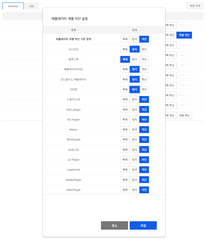 원하시는 대로 설정을 진행하시면 되며, 리스트에 없는 에뮬레이터는 메뉴 맨 상단의 "에뮬레이터 개별 차단 기본 정책"의 설정을 적용 받게 됩니다.