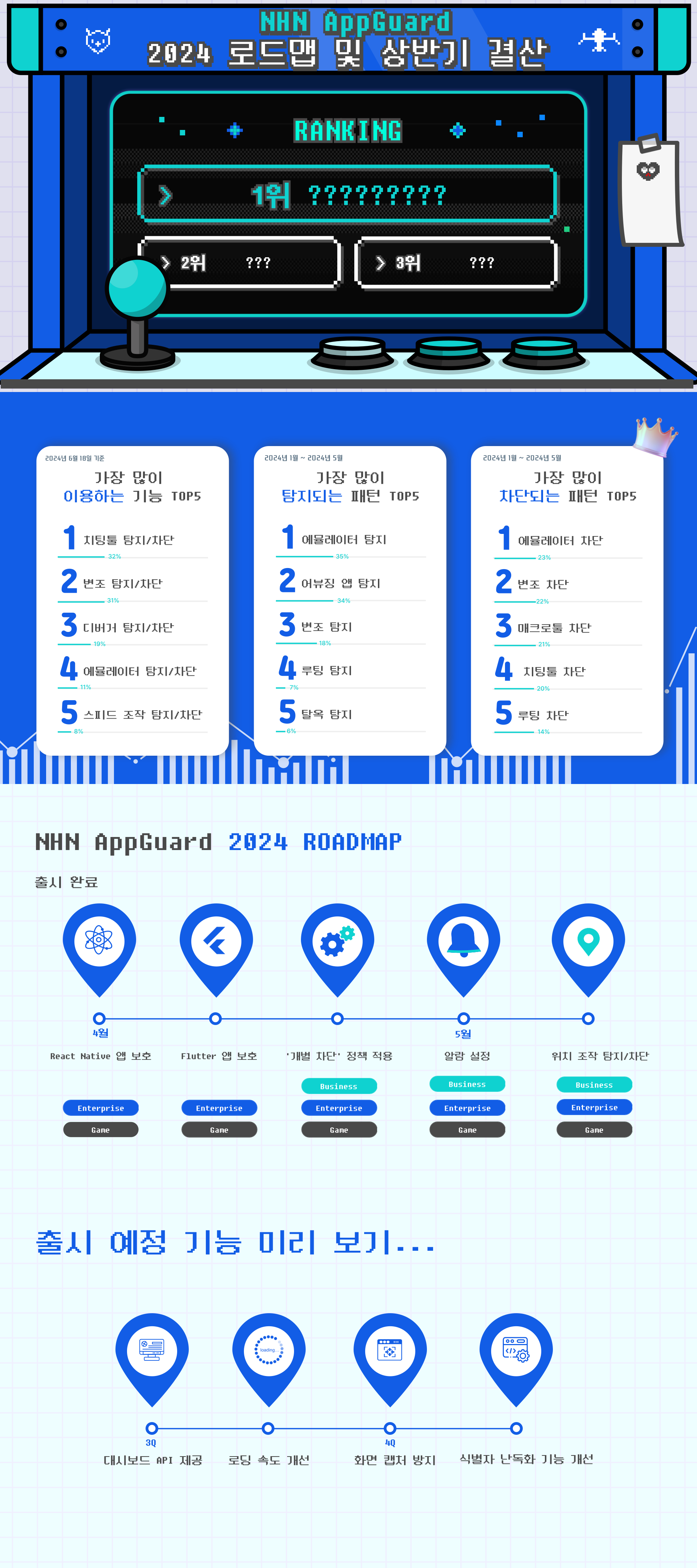 어느덧 2024년의 절반이 지났습니다. 모바일 애플리케이션의 보안 중요성이 점차 높아짐에 따라 NHN AppGuard는 다양한 보안 위협 패턴을 빠르게 파악하여 지속적으로 기능을 개선하고 있습니다. 이번 블로그 포스트에서는 2024년 상반기 동안 어떤 기능이 추가되었는지, 그리고 현재 NHN AppGuard 사용자들은 어떤 기능을 가장 많이 활용하고 있는지 알아보겠습니다.