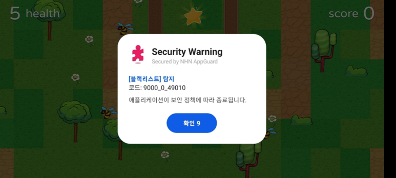 - 조건 차단 시 설정한 조건을 만족하면(임계치 이상일 경우 차단/미만인 경우는 탐지) 블랙리스트에 등록되며, 해당 사용자가 앱을 실행한 경우 NHN AppGuard 안내 창이 나타나고 앱이 종료됩니다.