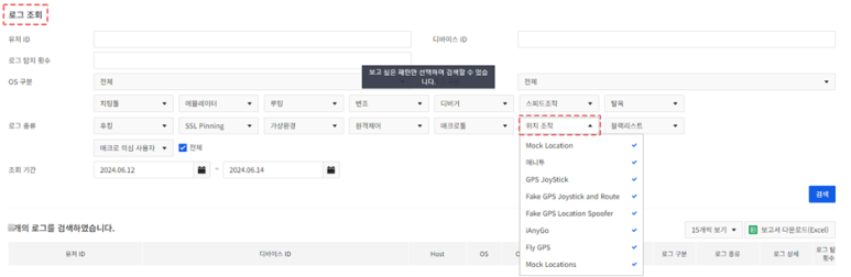 - ‘탐지’ 정책을 적용하면 앱 실행 도중 위치 조작 행위를 발견하였을 경우 로그로 기록됩니다.